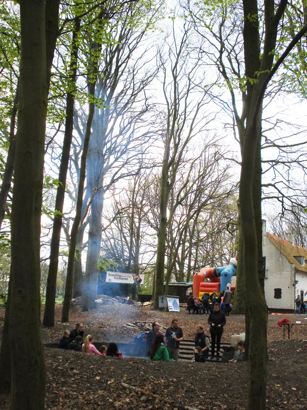 Zicht op het kampvuur in de kuil en het springkussen.
