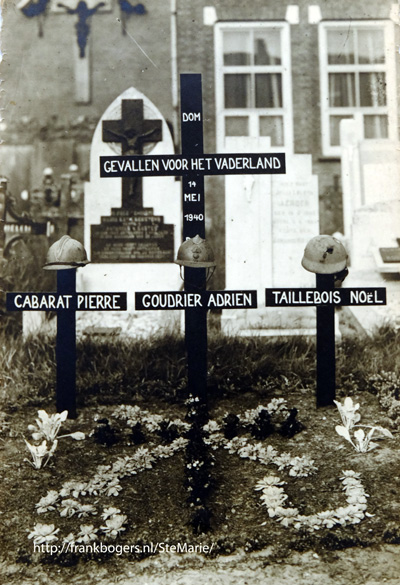 Foto 6: Franse soldaten gesneuveld tijdens de oorlog en begraven 14 mei 1940. Begraven in Huijbergen op de achtergrond het Alverno gebouw. Gevallen voor het vaderland. Cabarat Pierre - Goudrier Adrien - Taillebois Noël De helmen op het kruis. John van Keep herinnert zich nog dat de kogelgaten nog in de helmen te zien waren.