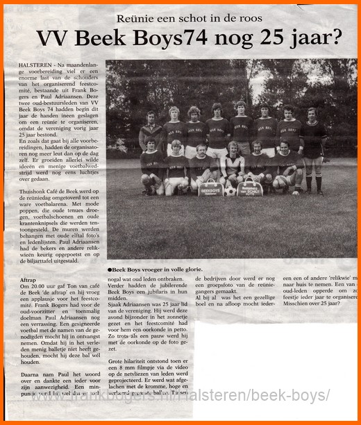Na maanden lange voorbereiding viel er een enorme last van de schouders van het organiserend feest comité, bestaande uit Frank Bogers en Paul Adriaansen. Deze twee oud-bestuursleden van VV Beek Boys 74 hadden begin dit jaar de handen ineen geslagen om een reünie te organiseren, omdat de vereniging 25 jaar bestond