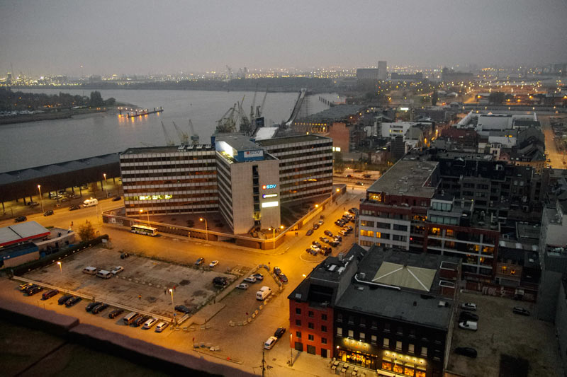 Vanaf het panorama dak boven het MAS museum is de stad Antwerpen goed te fotograferen