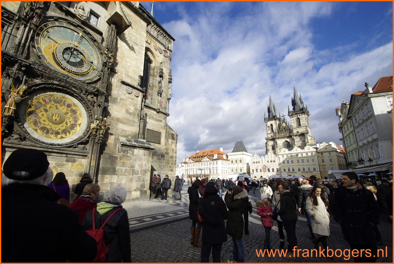 Frank poseert voor de astronomische klok in Praag. Ik