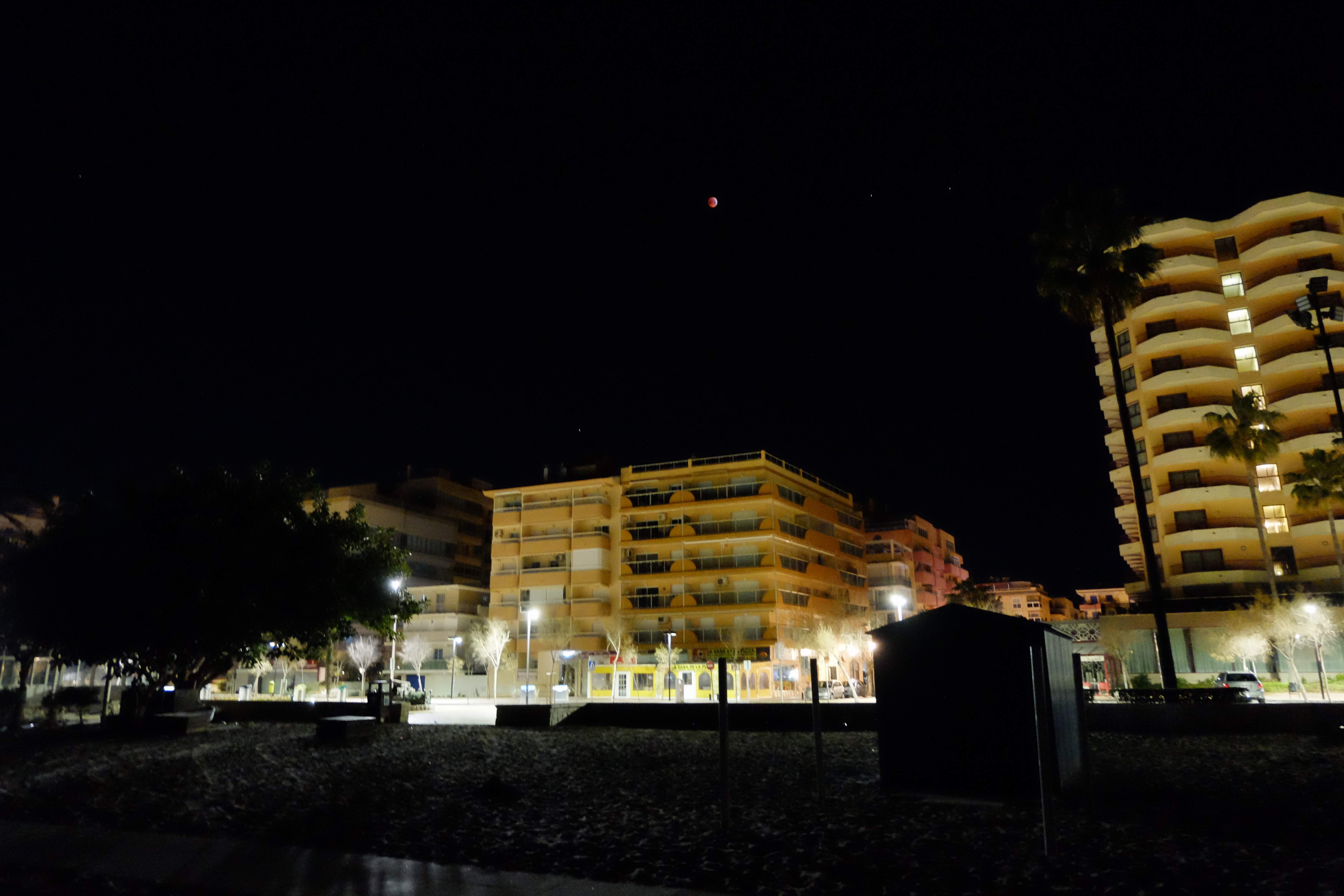 Hier staat de maan hoog tussen 2 appartementen in Fuengirola.