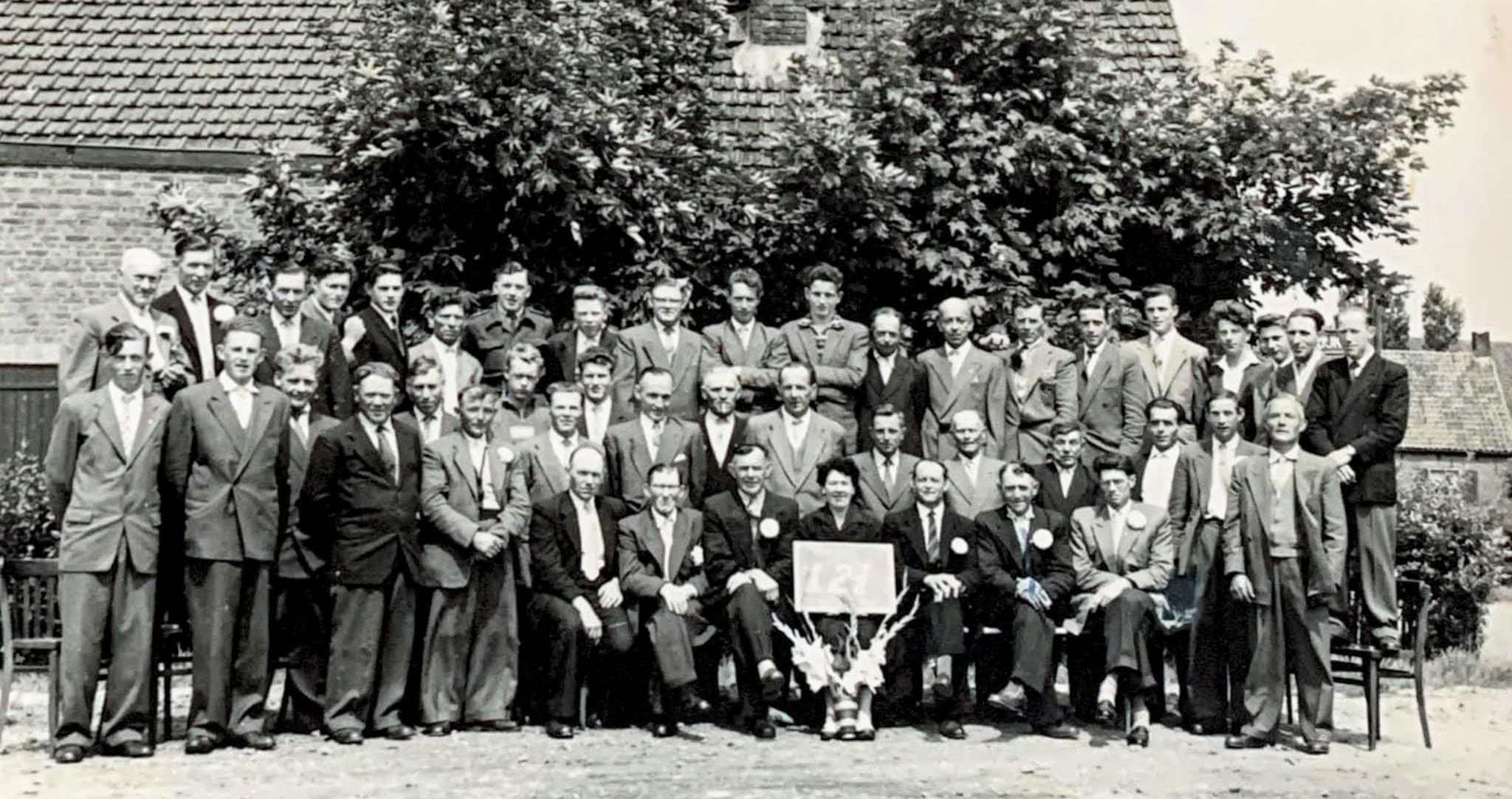 12 1/2 jaar bestaan van Duivenclub de Vredesduif. Zittend: Geert van Loon, Marijn Brouwers, Jan van Tillo, Pieta van Tillo-Kats, Rinus Roosendaal, Willem van Eekelen, Toon Jansen. Staand: Piet Keijl, Frans de Kock, Christ Geers, Jan van Eekelen, Piet van Wijk, Bart van Schilt, Marijn Raats, Jan van Schilt, Wim Clarijs, Christ v/d. Kieboom, Naan van Schilt, Cees van Tillo, Janus Veraart, Geert Suijkerbuik, Jan Bosters, Geert Otte, Pauw van Tillo, Puk van Schilt, Bovenste rij: Jan v/d. Veeren, Kees de Krom, Jan Roosendaal Mz, Jan Roosendaal Az, Sjel Maas, Dorus de Krom, Koos van Eekelen, Toon van Eekelen, Janus Roosendaal, Marijn Tunders, Marijn Schillemans, Christ Meesters, Jan Snelders, Kees van Schilt, Piet Roosendaal, Kees Ooms, Frans Bosters, Adriaan de Krom, Jan Brouwers, Rens Brouwers.
